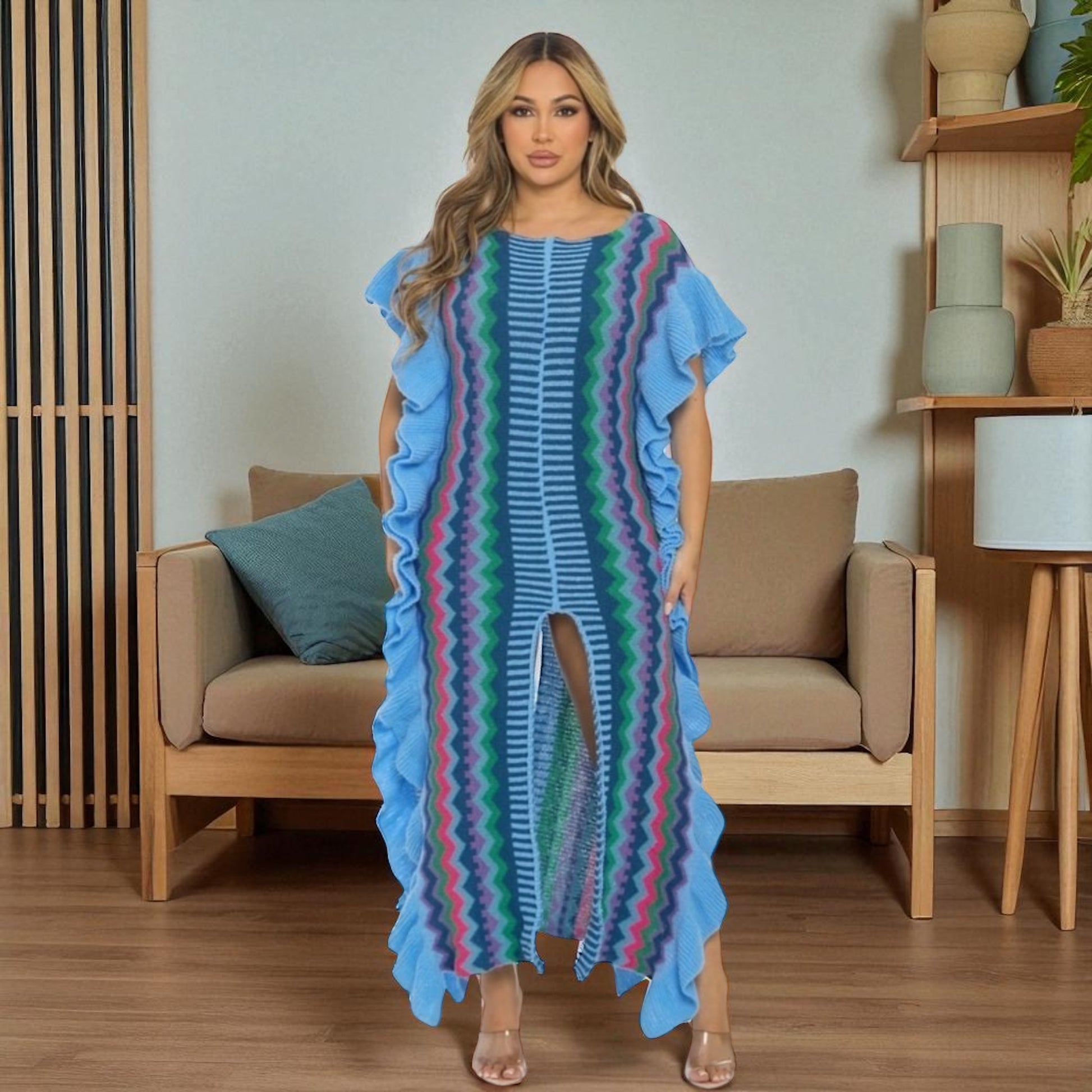 This soft sweater dress brings major texture and movement with dramatic ruffled sides, eye-catching zigzag knits, and a statement front slit.